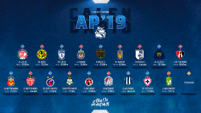 Este martes se dio a conocer el calendario para el Apertura 2019 de la Liga MX Femenil, la cual arrancará actividad el viernes 12 de julio y donde el conjunto camotero debutará el domingo 14 de julio recibiendo a Toluca en el Cuauhtémoc, donde hará de local en todos sus encuentros.