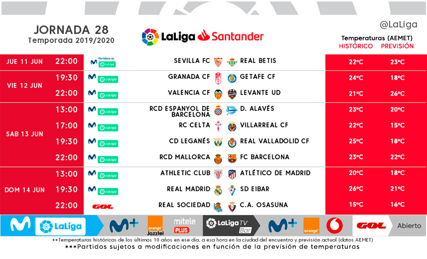 Sobre este tema, Tebas ha afirmado: "Hoy damos a conocer dos jornadas, de cuatro días cada una. Esta va a ser la tónica. Las demás jornadas no se han anunciado porque queremos conocer predicciones de temperaturas. Hemos estado trabajando durante estas semanas con predicciones históricas de la Agencia Española de Meteorología en ciudades donde tenemos equipo tanto de LaLiga Santander como de LaLiga SmartBank y también con las predicciones de temperaturas que está dando para dentro de 15 días. Si las predicciones de la AEMET fuesen cambiando, ese horario de la 13:00 horas cambiaría a las 17:00. Para nosotros es importante tener un partido a la 13:00 en sábado y domingo, para que nuestros aficionados en otras partes del mundo puedan ver esos partidos".