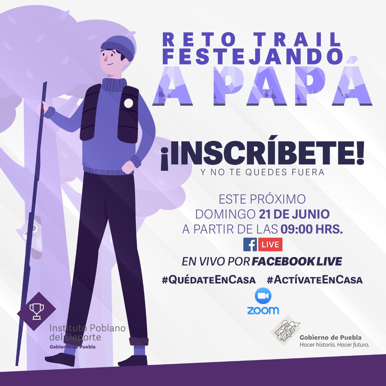 En conmemoración del Día del Padre, el Instituto Poblano del Deporte (INPODE), en coordinación con las direcciones de deporte municipal, lanza el “Reto Trail, Festejando a Papá”, consistente en recrear una carrera de montaña desde casa.