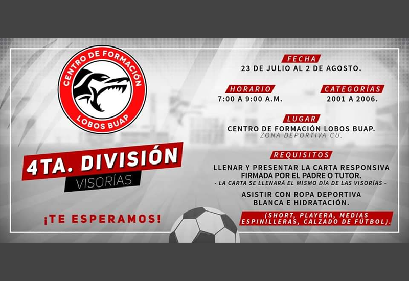 Las visorías arrancaron desde este martes 23 de julio y culminarán el próximo viernes 2 de agosto con un horario de 7 a 9 de la mañana, teniendo como sede las canchas del Centro de Formación de la BUAP, a un lado del estadio Universitario, donde Lobos jugaba como local, y estando dirigidas a chicos nacidos del 2001 al 2006.