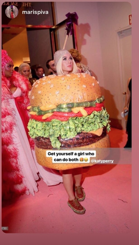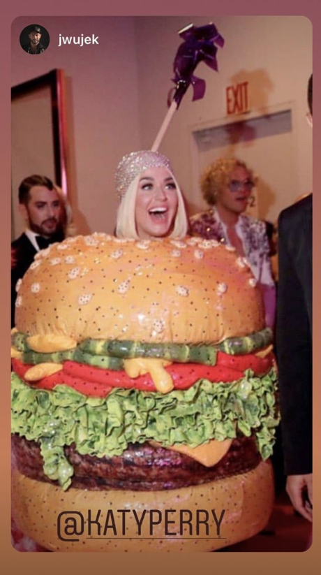 Y cuando todos terminábamos de aplaudir la imaginación extrema de la prometida de Orlando Bloom, esta nos sorprende con una deliciosa transformación; cambió su luminoso vestuario por una deliciosa hamburguesa.