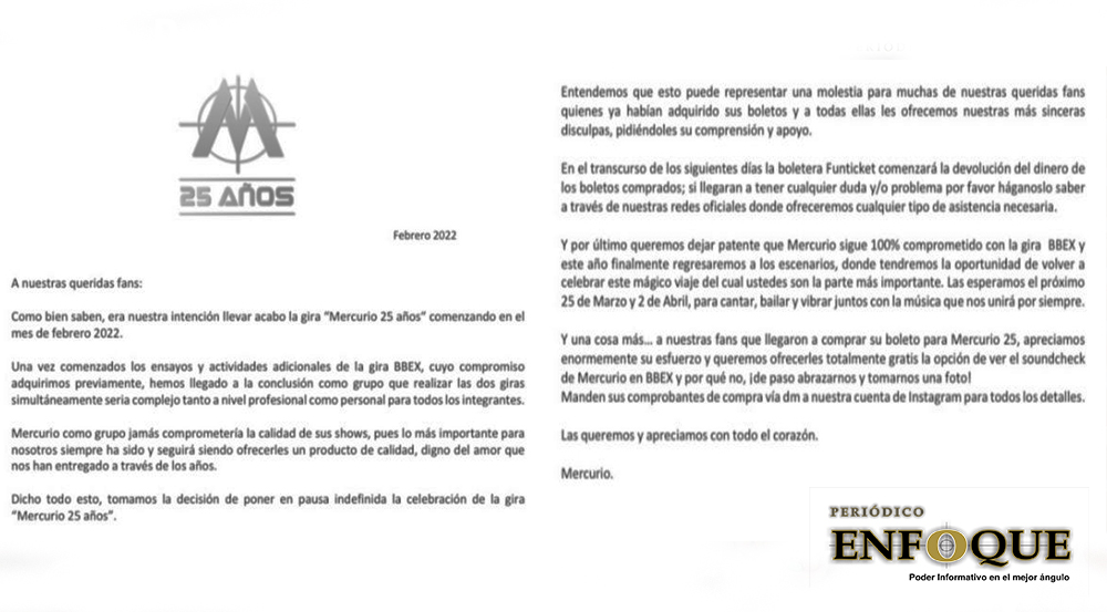 El grupo musical Mercurio lanzó un comunicado en donde informa a sus fans que la gira “Mercurio 25 años” se pone en pausa indefinidamente, pero la gira BBEX continúa para presentarse los días; 25 de marzo y 2 de abril de 2022.