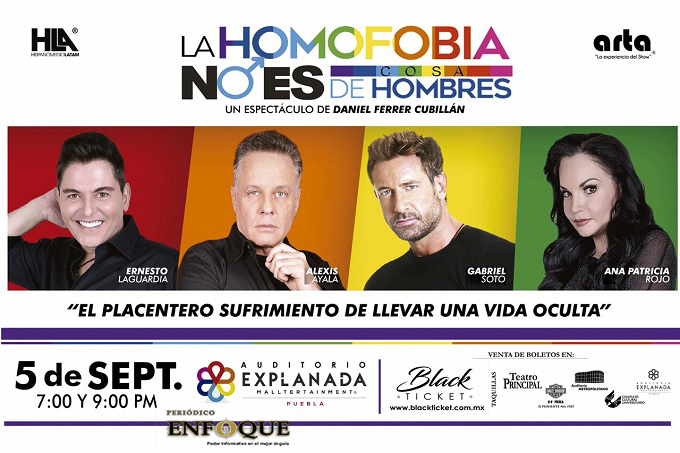 “La homofobia no es cosa de hombres” se presenta el 05 de 5 de septiembre 2019 en el Auditorio Explanada, Calle Alejandra Núm. 512 Local E-02, 72760 Cholula, Puebla. Serán dos funciones; 07:00 P.M. y 09:00 P.M.