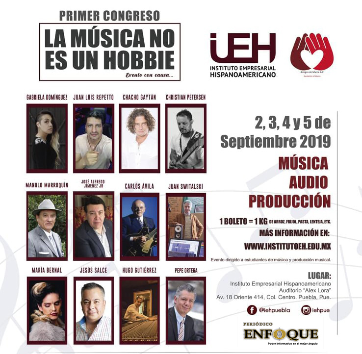 Del lunes 2 al jueves 5 de septiembre de 2019 se realizará el primer congreso nacional “La Música no es un Hobbie”, en el que productores, directores, ingenieros de audio, compositores y grandes músicos de la industria del espectáculo y de la música ofrecerán una serie de conferencias y talleres en donde compartirán sus experiencias en el Instituto Empresarial Hispanoamericano, Auditorio Alex Lora, Av. 18 Oriente #414, Col. Centro, Puebla, Puebla.
