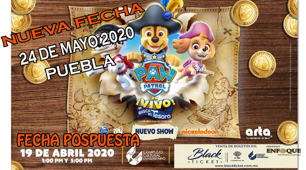 Puebla, Puebla. Paw Patrol “En busca del tesoro”, Puebla, pospone el 19 de abril, nueva fecha; 24 mayo de 2020 del Auditorio del Complejo Cultural Universitario, con dos funciones; 01:00 P.M. y 05:00 P.M.