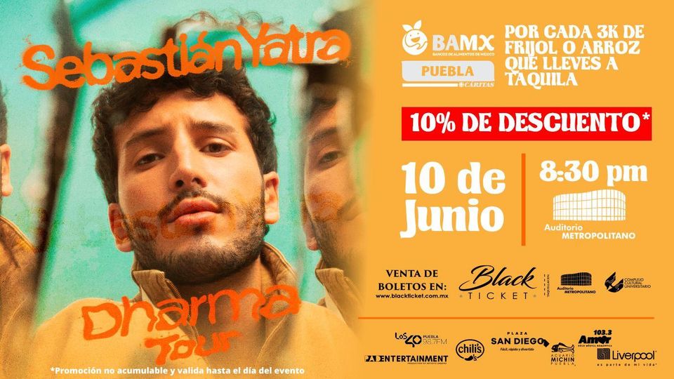 *Por cada 3kg de frijol o arroz que lleves a taquilla Banco de Alimentos Cáritas Puebla te da un 10% de DESCUENTO en la compra de tu boleto para que vivas #LaExperienciaDelShow de #DharmaTour con #SebastiánYatra