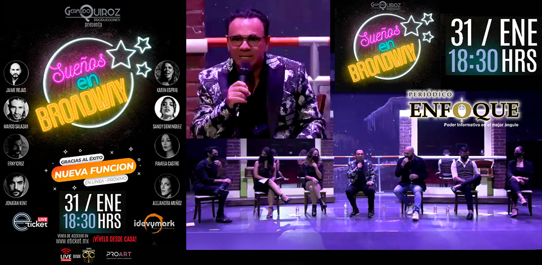 Ciudad de México. “Sueños en Broadway”, desde el Teatro Centenario Coyoacán, domingo, 31 de enero de 2021 a las 06:30 P.M. Elenco: Jaime Rojas, bailarín (cantante y Director de escena del musical), Karen Espriu (cantante), Sandy Domínguez, (cantante y bailarina) Pamela Castro (bailarina), Alejandra Muñoz, Jaime Rojas, Marco Salazar (actor), Erny Cruz (bailarín y coreógrafo), Mary Luz Gallo acróbata), Alejandra Muñoz y Jonatan Kent (bailarín argentino), montaje vocal de Hugo Robles, 8 músicos en vivo, además de una acróbata aérea, Iluminadores, camarógrafos y técnicos en audio, Duración del musical una hora con 20 minutos. Este será el 6To streamin. Un espectáculo para toda la familia. 12 escenarios visuales. Como un plus habrá un “making-of” (antes de empezar, cómo se hizo detrás de cámaras). #GerardoQuirozSueñosenBroadway.