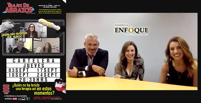 Puebla, Puebla, México. “Trajes de abrazos”, con Arath de la Torre, Yolanda Ventura y Susy Lu, 03, 10, 17 y 24 de septiembre de 2020, evento online. 08:30 P.M. (Horario ciudad de México)