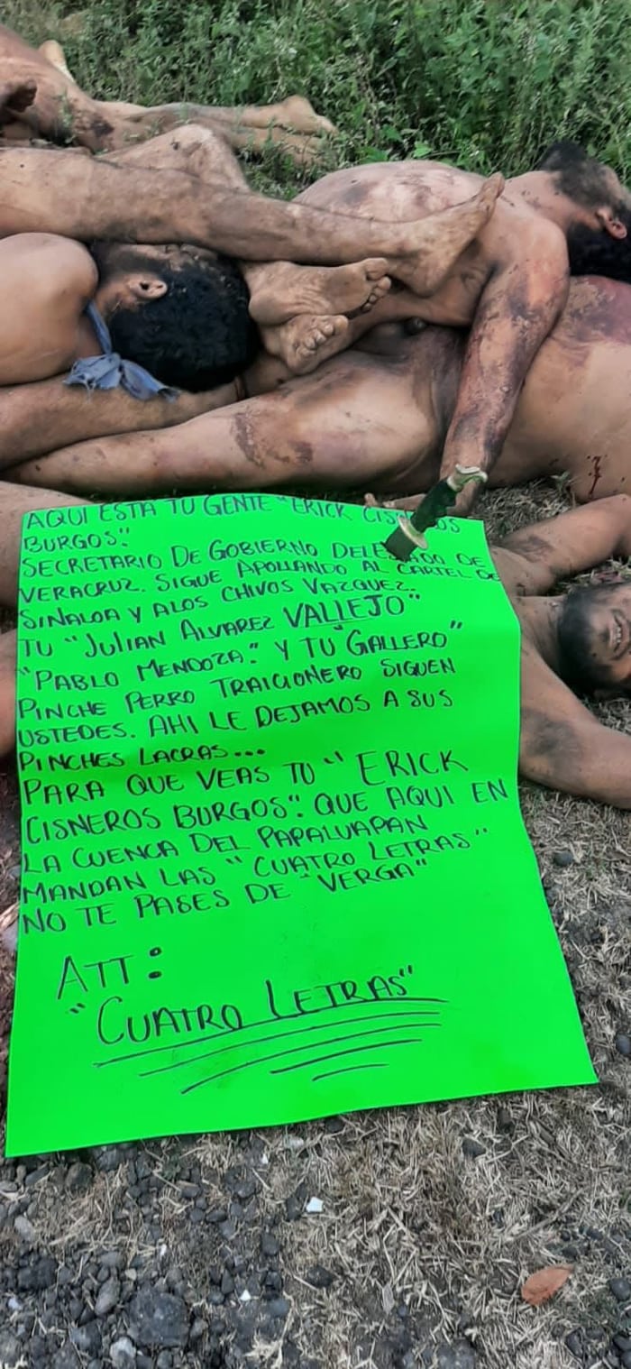 El descubrimiento se produjo luego de que varios automovilistas reportaran el hallazgo en el Kilómetro 118 de la autopista. Junto a los cadáveres se encontraba una cartulina con un mensaje, aparentemente firmado por miembros del Cártel Jalisco Nueva Generación (CJNG), que se atribuían el múltiple homicidio y lanzaban una advertencia al secretario de Gobernación de Veracruz, Eric Cisneros Burgos.