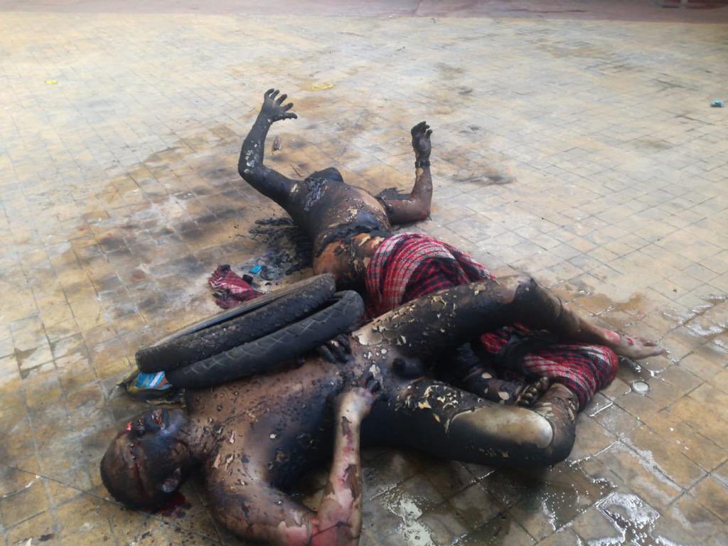 Finalmente a las 17:05 horas los dos sujetos, quienes dijeron ser primos y tener su domicilio en Jiutepec, fueron sacados por la fuerza de los separos y rociados con combustible para ser quemados en la explanada del Ayuntamiento ante la presencia de policías y autoridades municipales.