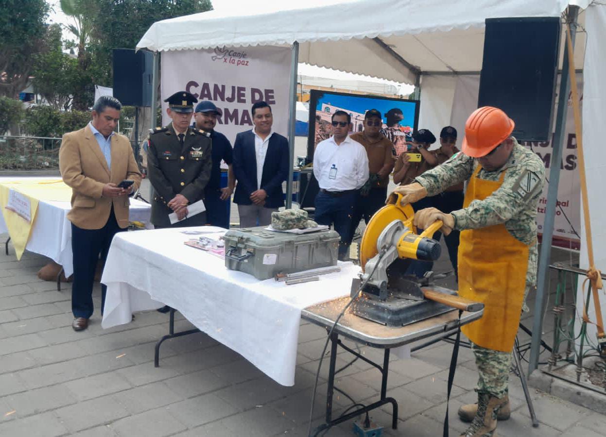 Acatzingo, Pue.- Personal del Ejército de la Jurisdicción de la 25 Zona Militar en coordinación con la Guardia Nacional (GN), Gobierno del Estado y Municipios, llevaron a cabo el establecimiento del módulo de canje de armas “Canje por la Paz, Si al Desarme, Si a la Paz”, en Acatzingo y Tepeaca.