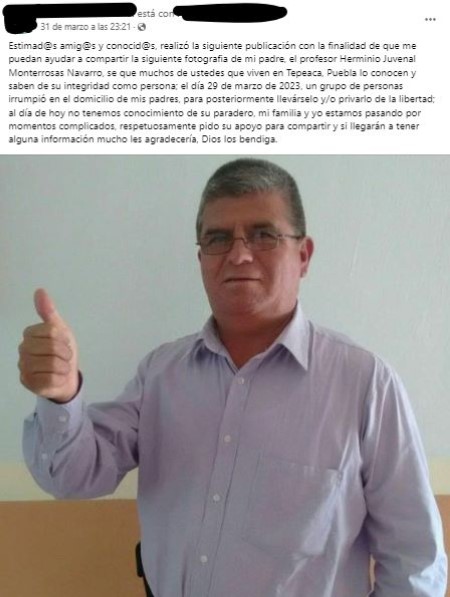 Fue a través de redes sociales que el hijo del también profesor Herminio Juvenal, dio a conocer que el pasado miércoles su papá privado de su libertad por un grupo de personas sin que, hasta el momento se tengan informes de su existencia.