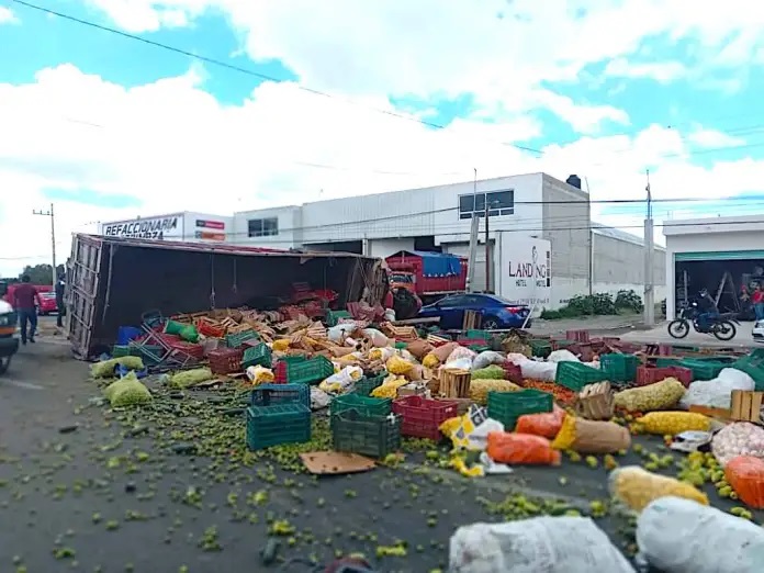 Según el primer reporte, el accidente se registró aparentemente por exceso de velocidad, el camión de verdura impactó primeramente al vehículo compacto y posteriormente volcó sobre la carpeta asfáltica.