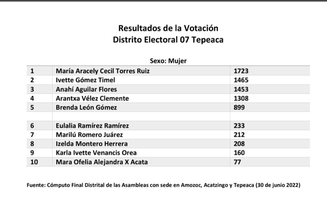 Mientras que por las mujeres la votación fue la siguiente: María Aracely Cecil Torres Ruiz obtuvo mil 723 votos, Ivette Gómez Timel mil 465, Anahí Aguilar Flores mil 453, Arantxa Vélez Clemente mil 308, y cerrando los otros cinco consejeros, Brenda León Gómez consiguió con 899 sufragios.