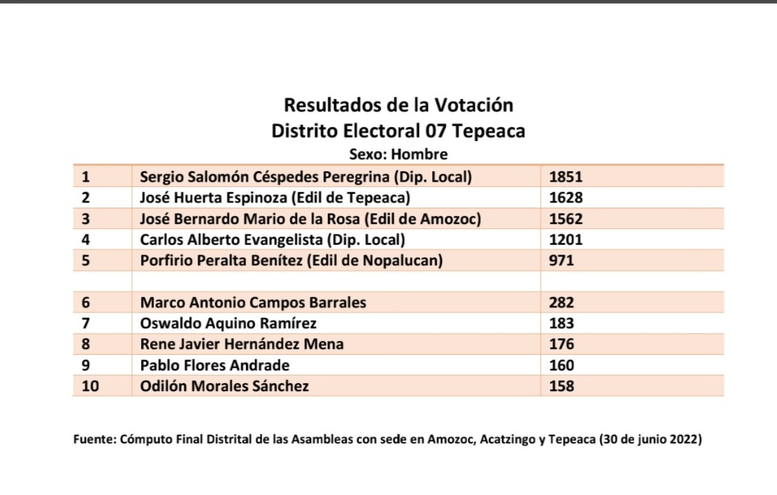 Fue que Sergio Salomón Céspedes Peregrina, diputado local por el distrito obtuvo el triunfo contundente en la elección con mil 851 sufragios, mientras que edil de Amozoc, Mario de la Rosa obtuvo mil 562, en tanto que Carlos Evangelista, diputado local consiguió mil 201 votos y Porfirio Peralta Benítez, alcalde de Nopalucan alcanzó 971 sufragios conformándose los primeros cinco consejeros.