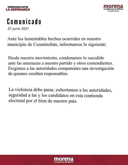 Ante esta situación, el comité Municipal de Morena lamentó los hechos ocurridos y exigió a la autoridad competente que inicié con una investigación de quienes resulten responsables.