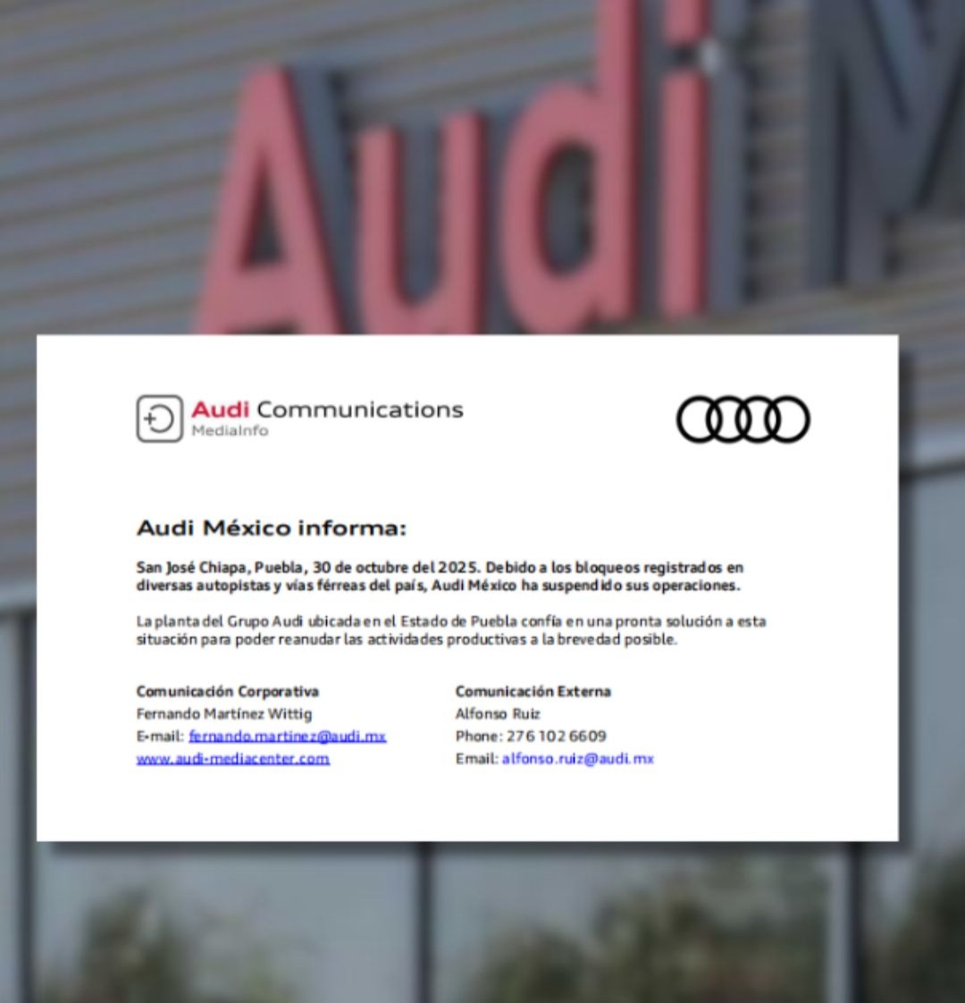 San José Chiapa, Pue.- Mediante un comunicado por parte de la empresa armadora de vehículos AUDI ubicada en el municipio de San José Chiapa, anunció la suspensión de sus operaciones por tiempo indefinido debido a los bloqueos que campesinos mantienen en diversas vías de comunicación (autopistas y vías férreas) del país.
