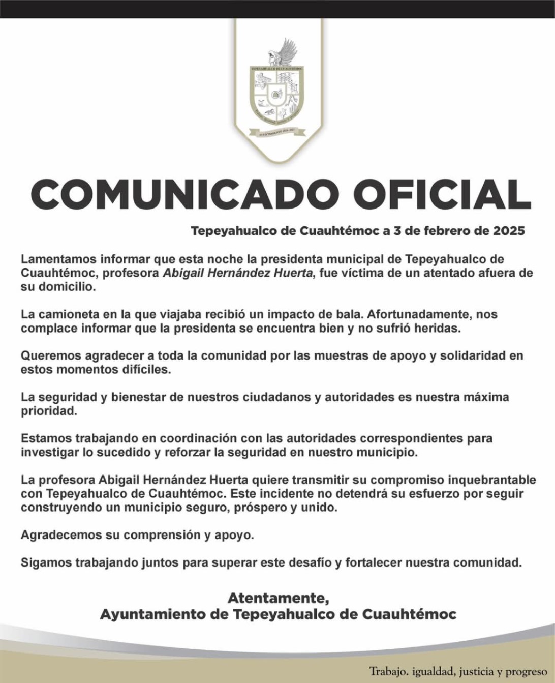 En un comunicado oficial por parte del ayuntamiento de Tepeyahualco, dio a conocer que el atentado en contra de la presidenta emanada bajo los colores de Fuerza por México se presentó la noche cuando ella se encontraba en el interior de su camioneta, la cuál sólo presentó un impacto de bala.