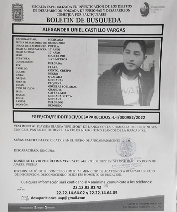 Los Reyes de Juárez, Pue.- Amigos y familiares buscan a Alexander Uriel Castillo Vargas, de 17 años de edad, quien desapareció el pasado 24 de agosto cuando salió del municipio de Los Reyes de Juárez para dirigirse al municipio de Acatzingo con el fin de pagar su inscripción.