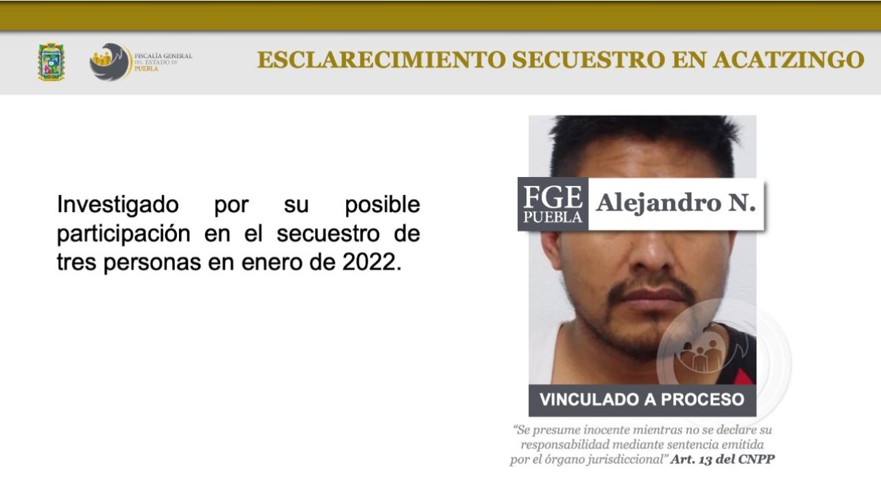 El titular de Especial en Secuestro y Extorsión en Puebla relató que el 24 junio del 2022, con apoyo de la Unidad Especializada en Combate al Secuestro de la Fiscalía General de Veracruz se capturó en el municipio de Orizaba a un primer investigado de nombre Brayan Alexis N., quien el 30 de junio del 2022 fue vinculado a proceso por el delito de secuestro agravado. Y en la continuación de la investigación se estableció la presunta participación de Alejandro N. en la privación de la libertad de las personas referidas.