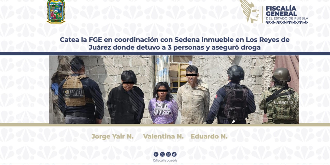 Los Reyes de Juárez, Pue.- La Fiscalía General del Estado de Puebla en coordinación con la Secretaría de la Defensa Nacional (SEDENA), realizó un cateo en el municipio de Los Reyes de Juárez, Puebla, logrando el aseguramiento de Eduardo N., Jorge Yair N. y Valentina N., de 31, 20 y 40 años de edad respectivamente, presuntamente en posesión de 50 dosis de droga.