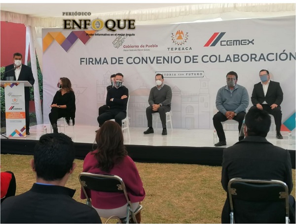 Tepeaca, Pue. - Este día, el Presidente Municipal de Tepeaca, Sergio Salomón Céspedes Peregrina junto con la Secretaria de Economía en el estado, Olivia Salomón; y Ricardo Naya Barba, Presidente Nacional de Cementos Mexicanos (Cemex), firmaron el convenio de colaboración que impulsará y fortalecerá la infraestructura del municipio.