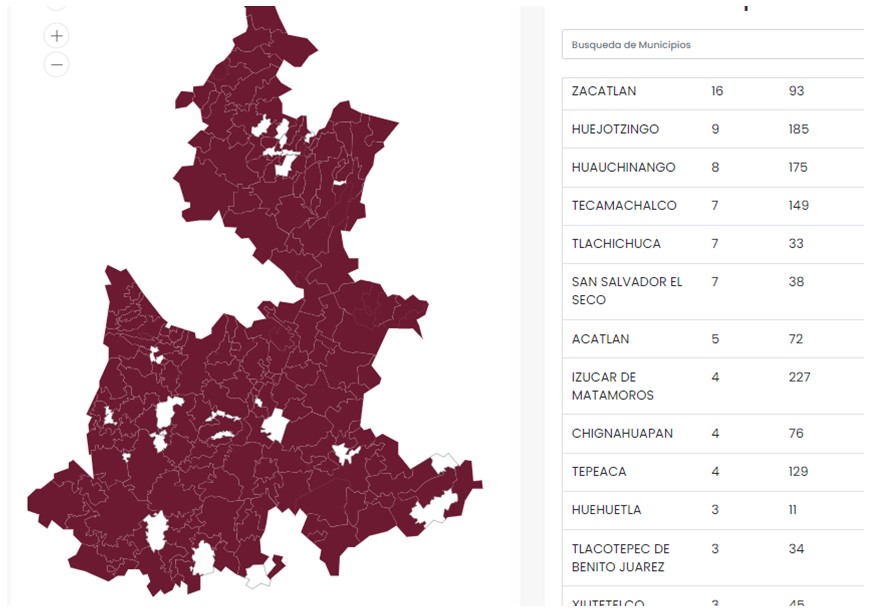 Los casos activos suman 3 mil 582 en 65 municipios, el municipio de Amozoc registra 13 casos activos y 147 defunciones; Tepeaca, cuatro casos activos y 129 defunciones; Tecamachalco, siete activos y 149 decesos, entre otros por mencionar.