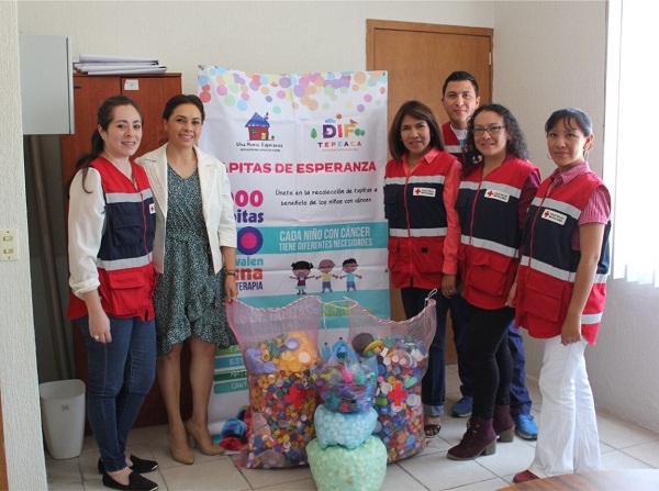 Tepeaca, Puebla. Con el objetivo de apoyar a niños y niñas con cáncer, miembros de Cruz Roja Mexicana delegación Tepeaca entregaron “tapitas de esperanza” al sistema de Desarrollo Integral de la Familia (DIF) municipal, en la cual la presidenta Gabriela Bonilla Parada agradeció a la institución por sumarse a tan noble causa.