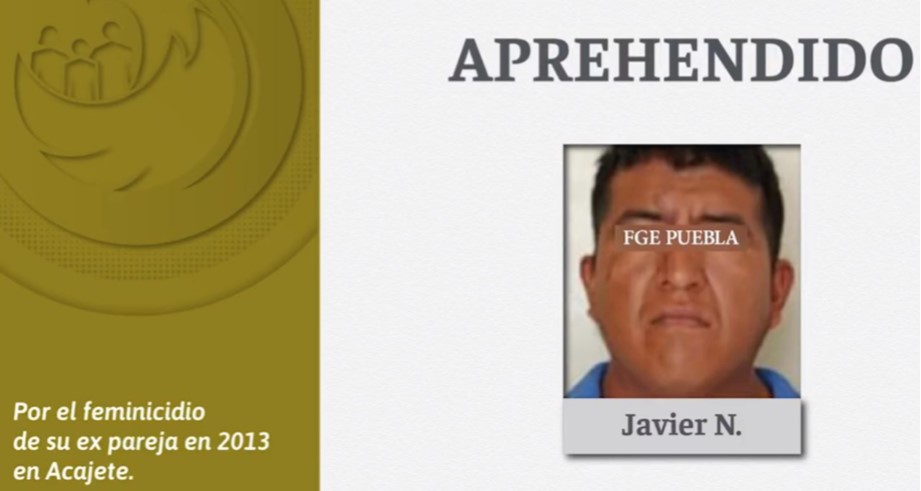 Acajete, Pue.- La Fiscalía General del Estado (FGE) de Puebla informó que agentes investigadores lograron detener a Javier N., feminicida de Araceli N., el cual se mantuvo prófugo de la justicia por 10 años.