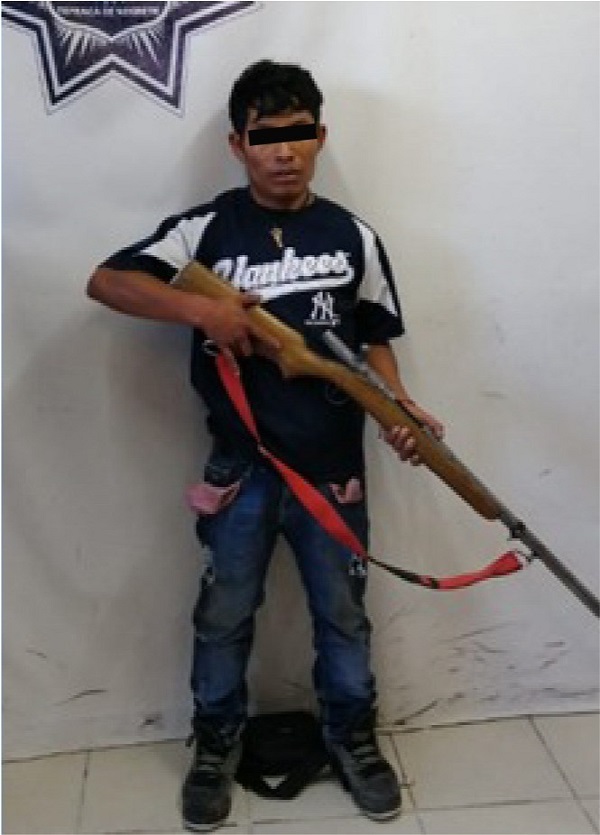 Tepeaca. Elementos de Seguridad Pública Municipal de Tepeaca aseguraron a Julio. N de 26 años de edad por portar arma de fuego sin permiso y realizar detonaciones en la vía pública.