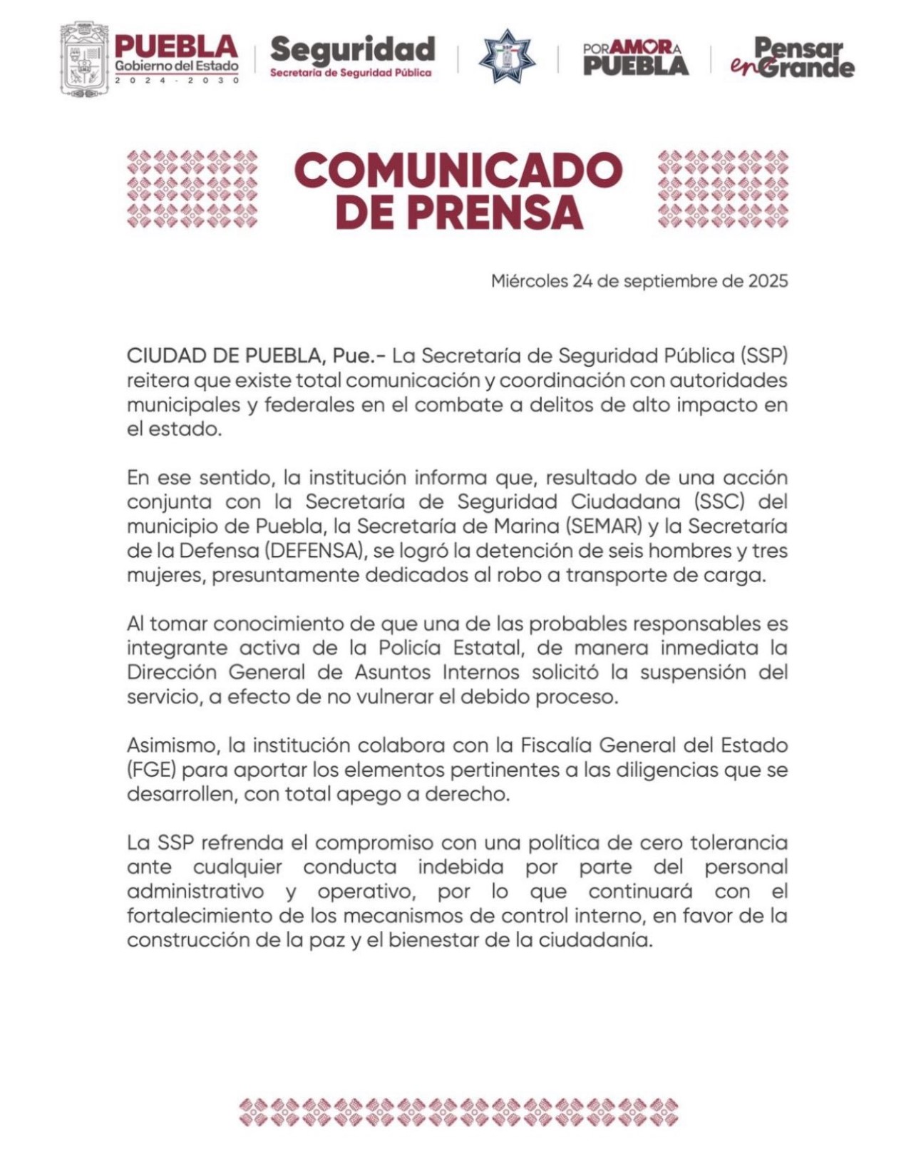 A través de un comunicado de la Secretaría de Seguridad Pública (SSP) informó que una de las nueve personas aseguradas en el Periférico Ecológico por robo de carga se identificó como agente activo de la Secretaría.