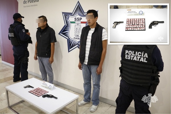 Amozoc, Pue.- La Secretaría de Seguridad Pública informó la detención de dos presuntos vendedores de armas, identificados como Israel Delfino V. y Sergio V., fueron detenidos en inmediaciones de la carretera federal Puebla-Tehuacán.
