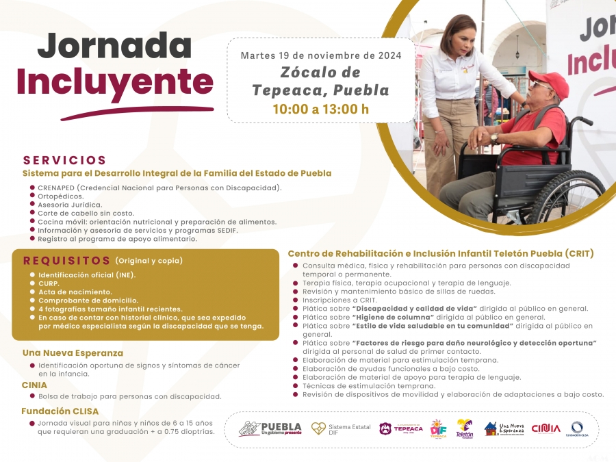 Tepeaca, Pue.- Con el objetivo de propiciar una cultura de inclusión social y en apoyo a grupos en situación de vulnerabilidad, el gobierno del estado de Puebla, a través del Sistema Estatal del Desarrollo integral de la Familia (DIF), realizará la última edición de las “Jornadas Incluyentes” del 2024, el próximo martes 19 de noviembre en el zócalo de la cabecera municipal de Tepeaca.