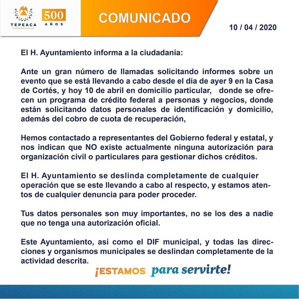 Ante esta situación, el Gobierno Municipal de Tepeaca emitió un comunicado donde asegura que se contactó con representantes del gobierno federal y estatal y actualmente no existe ninguna autorización para organización civil o particulares para gestionar dichos créditos, y se deslindó de cualquier operación.