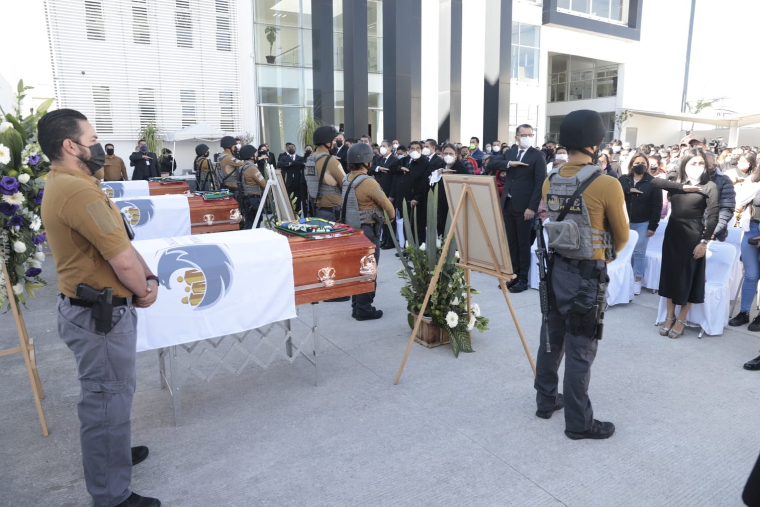 Puebla, Pue.- El mandatario estatal, Miguel Barbosa Huerta encabezó la ceremonia luctuosa de los agentes José Guillermo, Ardían y Miguel quienes murieron en el cumplimiento de su deber el viernes pasado en Tecamachalco.
