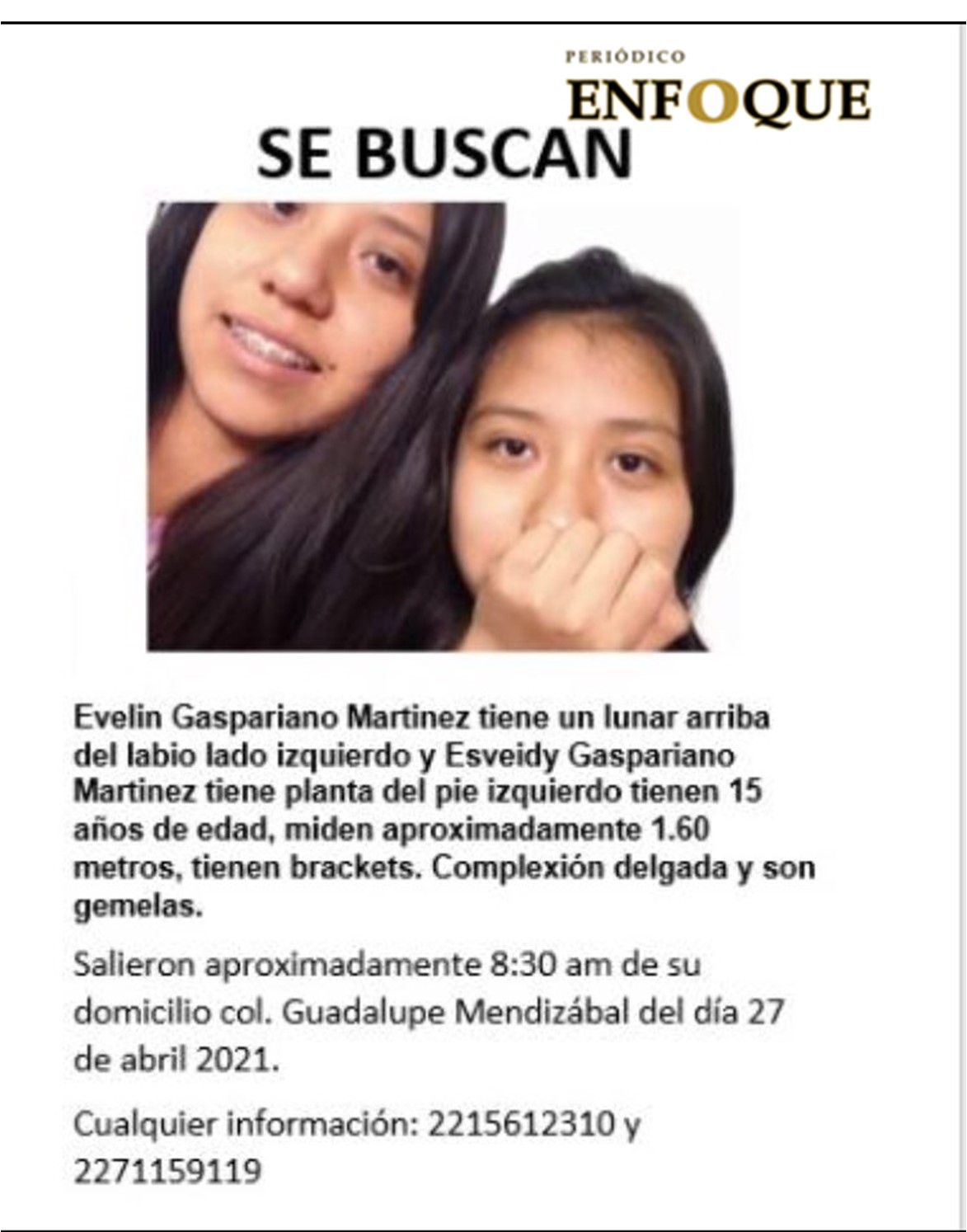 Amozoc, Pue.- Familiares y amigos buscan a las gemelas Evelin y Esveidy Gaspiriano Martínez de 15 años de edad, desparecidas la mañana de este martes en la colonia Guadalupe de la comunidad de Mendizábal en Amozoc.