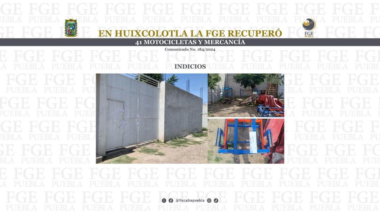 San Salvador Huixcolotla, Pue.- La Fiscalía General del Estado (FGE) de Puebla cumplió una orden de cateo en el municipio de San Salvador Huixcolotla donde aseguró más de 40 motocicletas y diversas mercancías de presunta procedencia ilícita, esto derivado de una investigación por el delito de robo de vehículo agravado.
