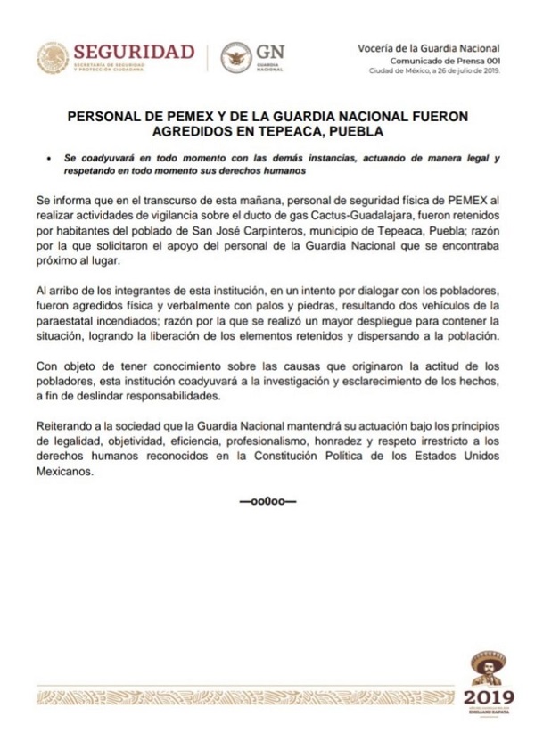 Mientras tanto, Manuel Alonso García, titular de la Secretaría de Seguridad Pública en el estado informó que los hechos suscitados en el municipio de Tepeaca el saldo fue de dos personas lesionadas, dos unidades de Pemex incendiadas, y la detención de al menos cinco presuntas personas que están relacionadas al robo de hidrocarburos, por lo que en caso de ser responsables serán castigadas conforme a ley.