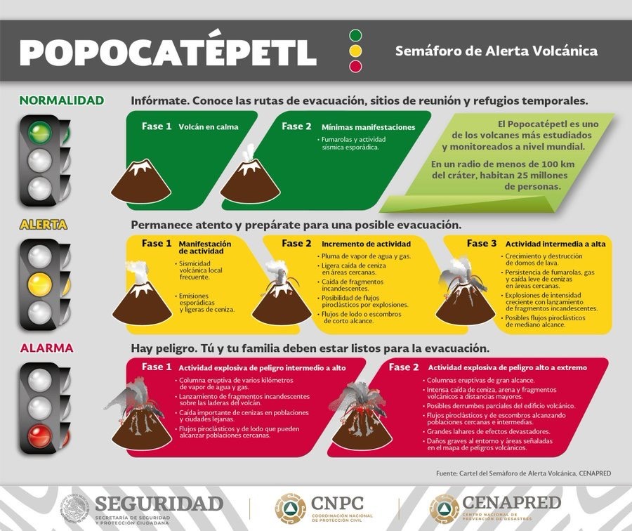 Se recomienda usar cubrebocas, proteger ojos, permanece atento a la información oficial, tener documentos importantes a la mano, los tres órdenes de gobierno permanecen atentos y en preparación para una posible evacuación, en caso de que se eleve el semáforo volcánico a rojo fase 1, en rueda de prensa la Coordinación Nacional de Protección Civil informó que el volcán es monitoreado las 24 hrs del día los 365 días del año y sus análisis y recomendaciones son basados en registros históricos, así como parámetros actuales que permiten tomar decisiones preventivas para salvaguardar a la población.