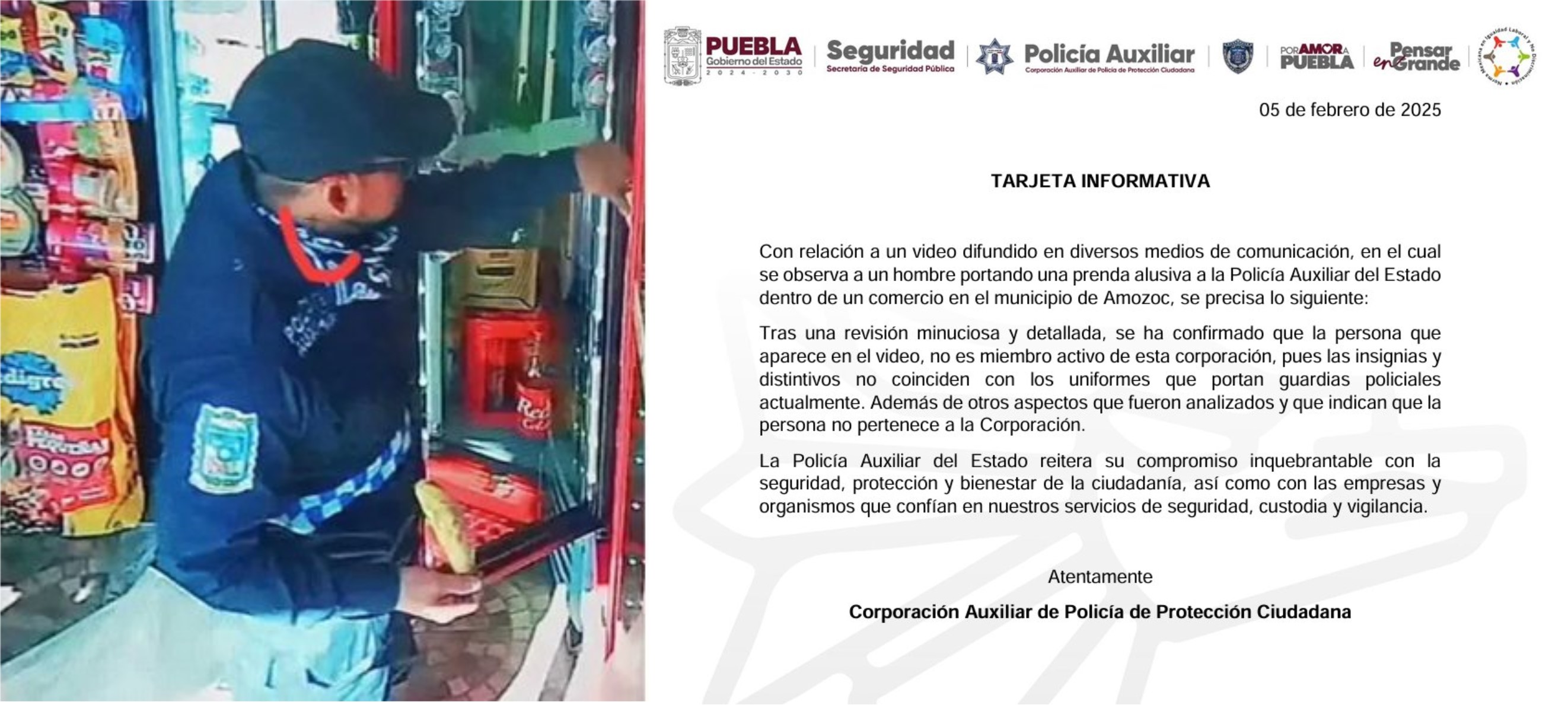 De acuerdo a la denuncia virtual, el hecho se registró durante la mañana del pasado martes 4 de febrero en una miscelánea que está ubicada en la colonia San José La Laguna en el municipio de Amozoc, en donde entró un masculino que portaba un uniforme de la Policía Auxiliar.