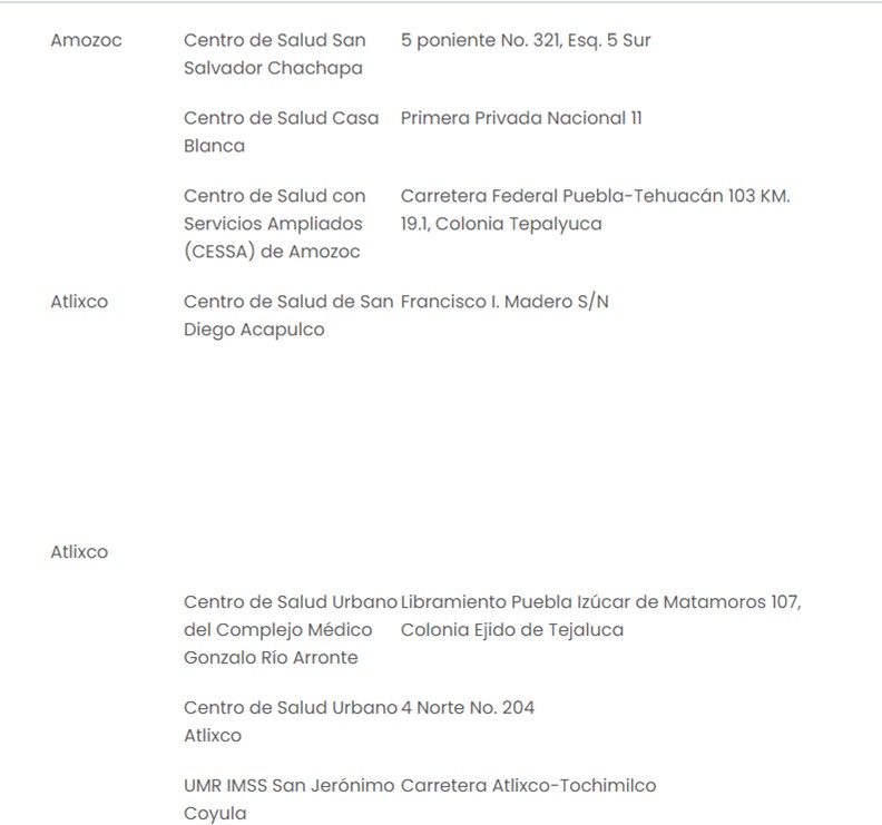 Para conocer qué punto de vacunación corresponde a las y los poblanos de esos municipios en dichos rangos de edad, así como los horarios o cualquier duda relacionada, las personas pueden comunicarse al 800 2 26 84 31 o buscar en la siguiente liga: https://previenecovid19.puebla.gob.mx/vacuna