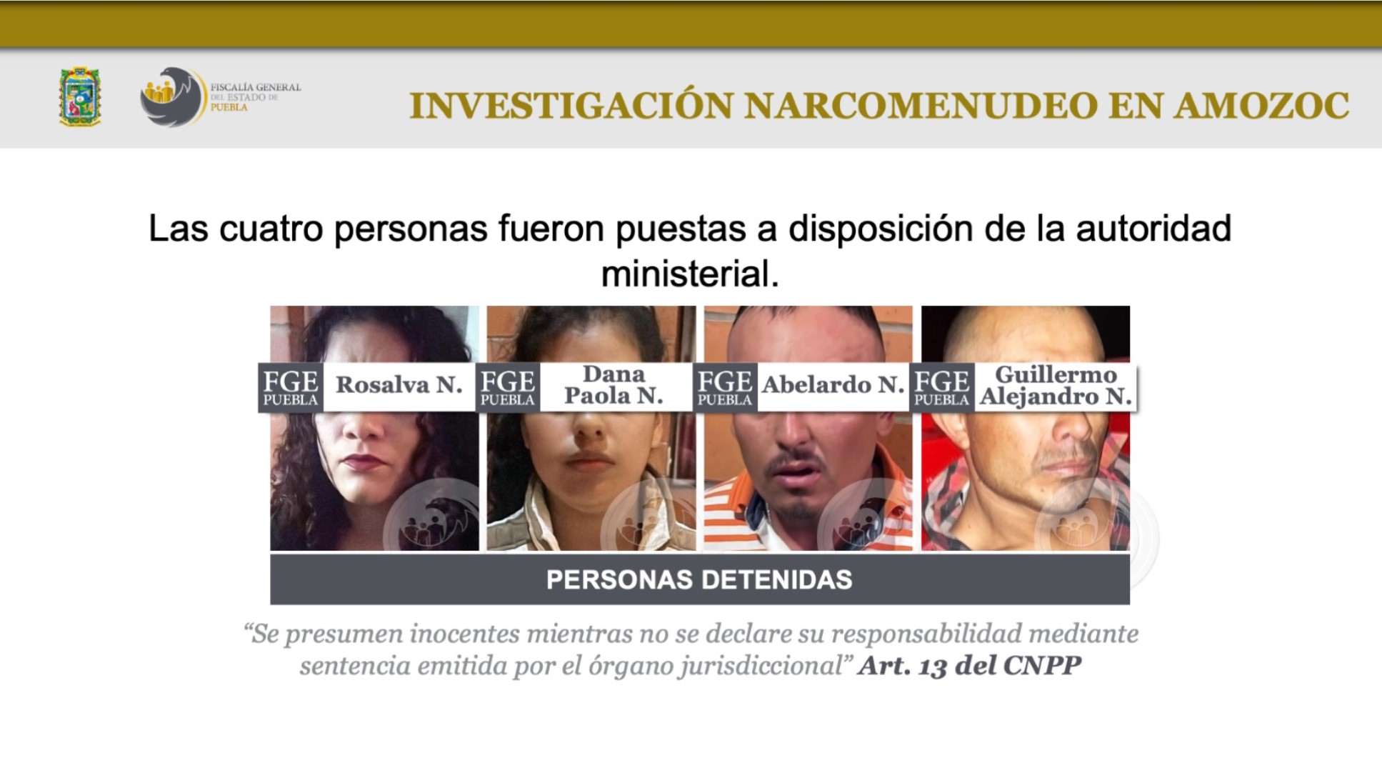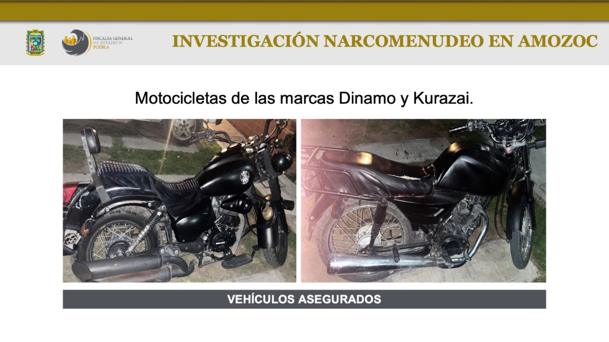 En Amozoc, las investigaciones de la Fiscalía por narcomenudeo, dejaron como resultado a un total de cuatro detenidos, dos motocicletas aseguradas y el decomiso de diversas cantidades de cristal y marihuana.