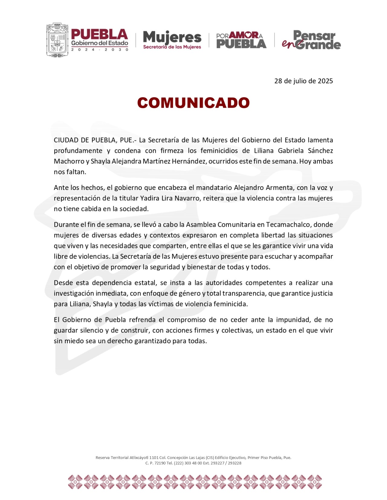 A través de comunicado, la dependencia señaló: “Hoy ambas nos faltan…, desde la instancia estatal, se insta a las autoridades competentes, a realizar una investigación inmediata, con enfoque de género y total transparencia que garantice justicia para Liliana, Shayla y todas las víctimas de violencia feminicida”.