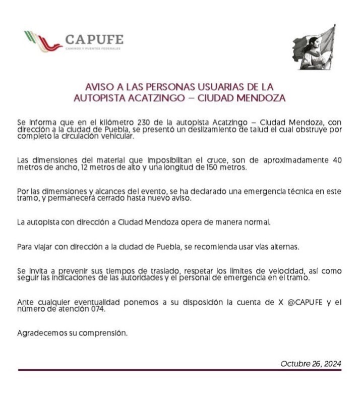 Luego de que la tarde de ayer sábado 26 de octubre de 2024 se registrara un derrumbe que provocó el cierre total de la autopista Puebla-Orizaba, en el tramo Acatzingo- Ciudad Mendoza, con sentido a Puebla, personal de Caminos y Puentes Federales CAPUFE dio a conocer que la circulación se mantendrá cerrada hasta nuevo aviso, y se declaró emergencia técnica.