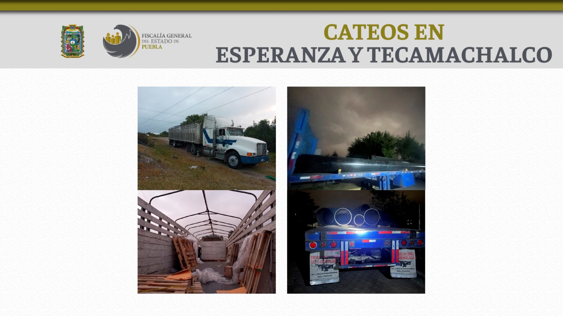 Derivado de las labores de investigación, el personal de la Fiscalía aseguró un tractocamión Dina acoplado a una jaula marca Díaz, así como una plataforma para tráiler cargada con seis tubos metálicos.