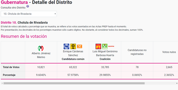 San Pedro Cholula, Pue. En el distrito federal 10 con cabecera en este municipio, el día de ayer 2 de junio salieron a votar 112, 671 ciudadanos de los cuales 65 mil 322 votaron por Enrique Cárdenas, mientras que 33 mil 785 por Miguel Barbosa y 10, 821 por Alberto Jiménez.
