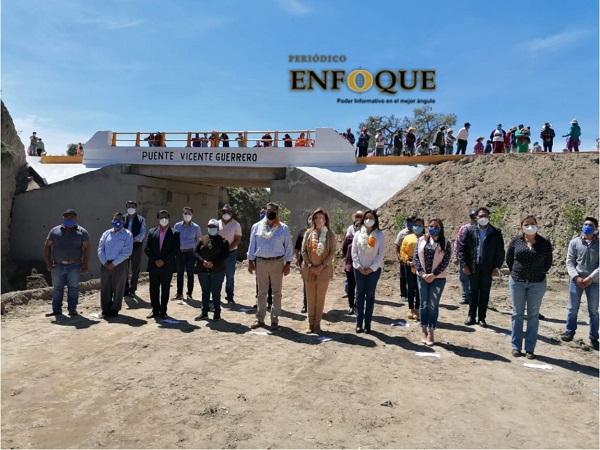 Por su parte, el alcalde municipal informó que dada la circunstancia y privilegiando la seguridad de las personas, este puente ya era un riesgo para la población “pues al pasar se cimbraba, los productores de cosechas ya no querían pasar y es un paso obligado para dirigirse a esta zona de la región (Tepeaca – Acatzingo), por lo que, ante la demanda muy sentida, se hicieron los estudios necesarios para que se hiciera esta obra llamada Puente Vicente Guerrero”, comentó.