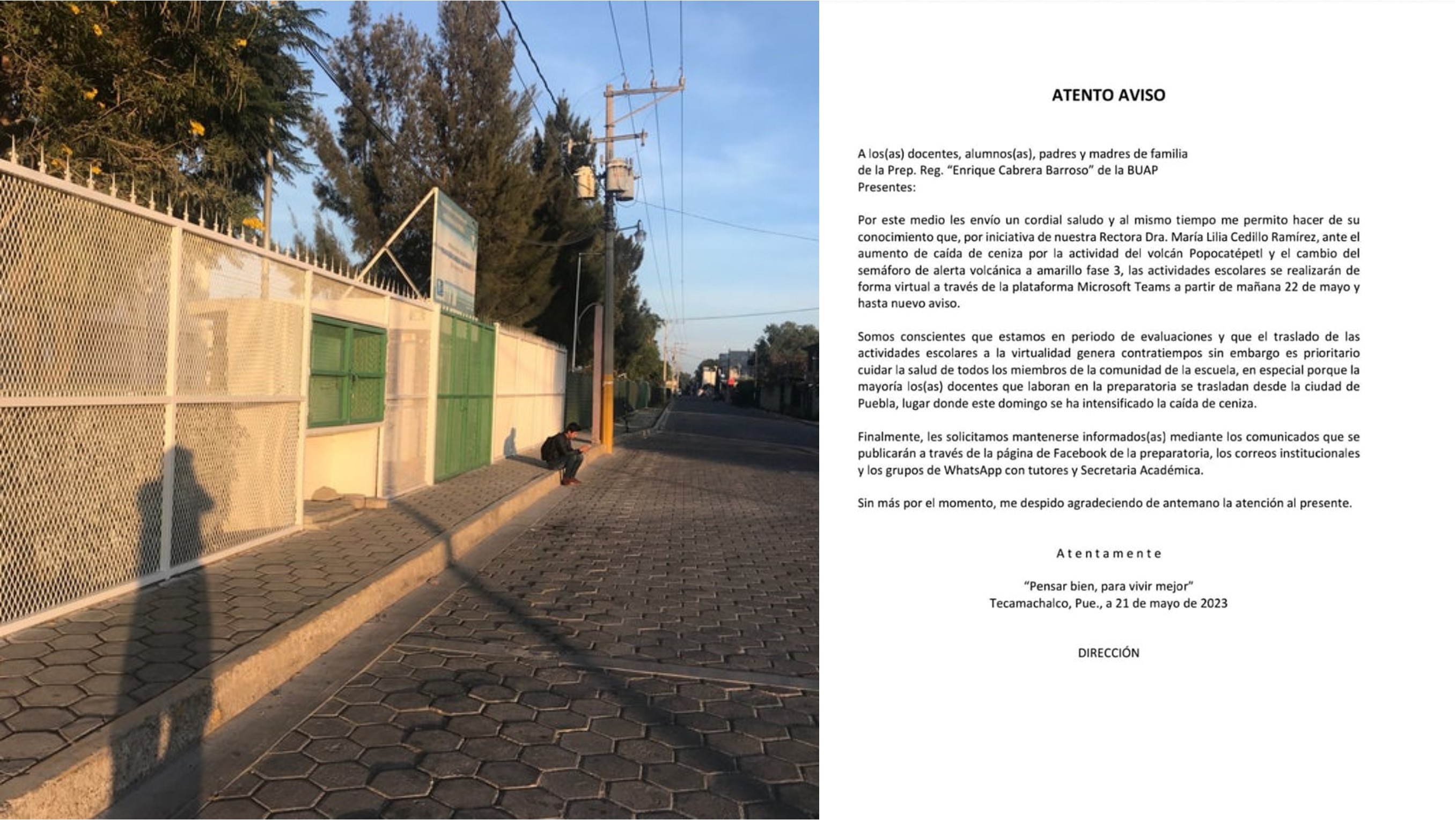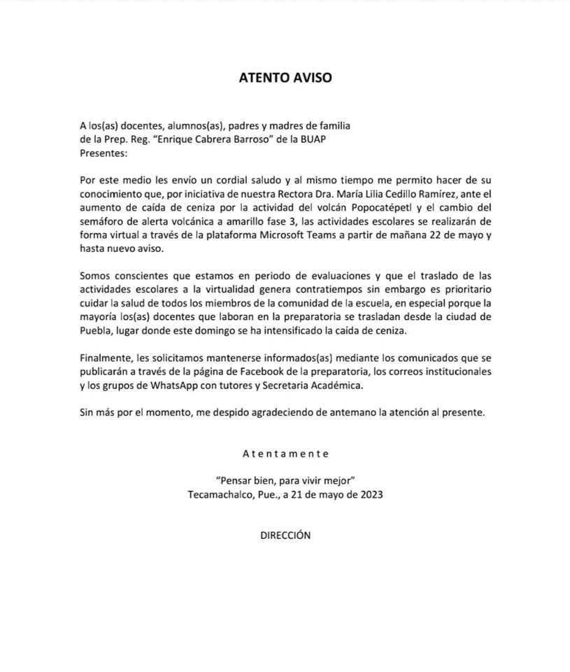 El comunicado detalla que, por iniciativa de la rectora María Lilia Cedillo Ramírez y ante el aumento de caída de ceniza por la actividad del volcán Popocatépetl, el cambio del semáforo de alerta volcánica a amarillo fase 3, las actividades escolares se realizarán de forma virtual, a partir de este lunes 22 de mayo, hasta nuevo aviso.
