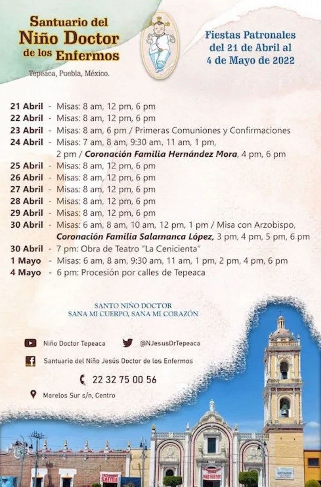 Y el 4 de mayo se realizará la procesión de la imagen por las principales calles del municipio de Tepeaca, con esta actividad se concluyen las festividades del Santo Niño Doctor de los Enfermos.