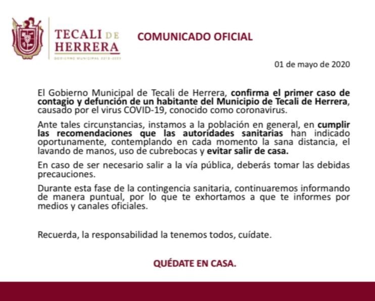 Tecali de Herrera, Pue.- Esta mañana el Secretario de Salud, Humberto Uribe Téllez confirmó la muerte de la primera persona por Covid-19 originaria del municipio de Tecali de Herrera; además informó que el virus se extendió a 71 municipios.